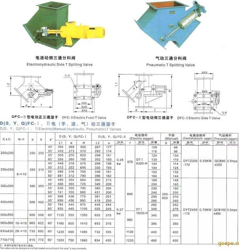 三通分料器別名三通卸灰閥。三通分料器有電液動,電動,氣動,手動等幾種啟動方式,所以又叫電液動三通分料器,電動三通分料器,氣動三通分料器,手動三通分料器。可以直接將上部法蘭接在膠帶機頭部漏斗下或其它設備下料接口處,其一般用于在堆比重小于等于2.8t/m、且磨琢性較大、工作環境惡劣的條件下。考慮到其結構尺寸大、重量大(耐磨襯板較厚),上部法蘭無法承受自身重量,使用須根據實際情況另加支承。
